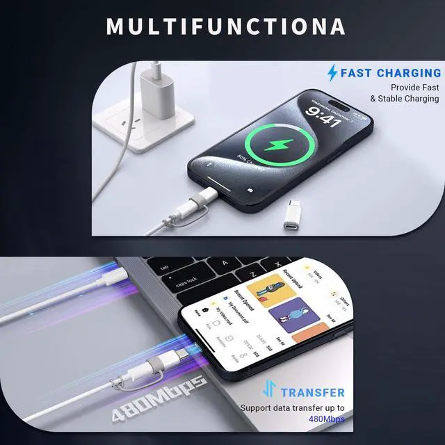 Turn your Apple Lightning cable into a USB-C charger in seconds! This 4-pack adapter set lets you charge USB-C devices (Android phones, tablets, Type C earbuds, and more) using your existing Lightning cables—perfect for travel, work, or home use.