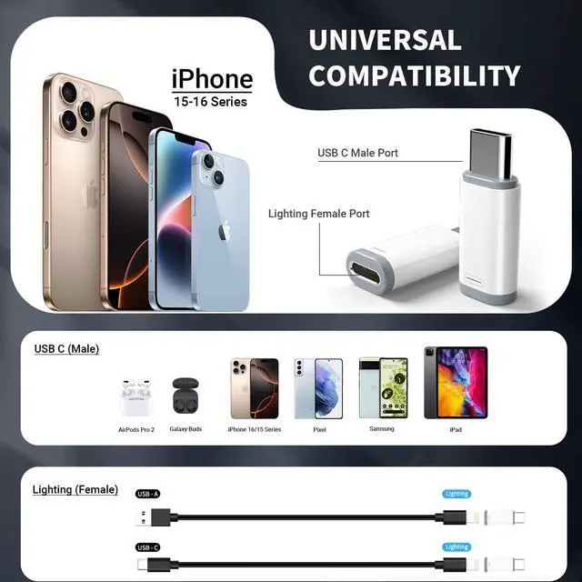 Lightning to USB C Adapter Lightning Female to Type C Male Charging Converter Fast Charging Compatible with iPhone 15/16 series and Samsung S21