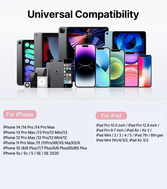 Compatible with iPhone 14,14 Plus, 14 Pro, 14 Pro Max, 13, 13 Mini, 13 Pro, 13 Pro Max, 12, 12 Mini, 12 Pro, 12 Pro Max, SE 2, 11 Pro Max, 11 Pro, 11, Xs Max, Xs, X, 8 Plus, 8, 7 Plus, 7, SE, 6S Plus, 6 Plus, 6S, 6, 5S, 5C, 5;
