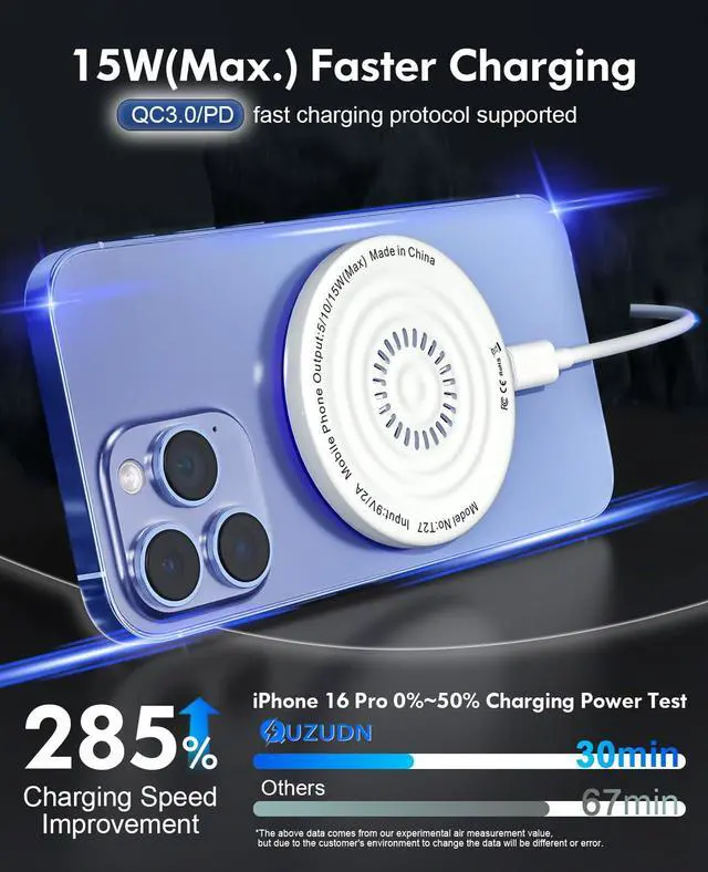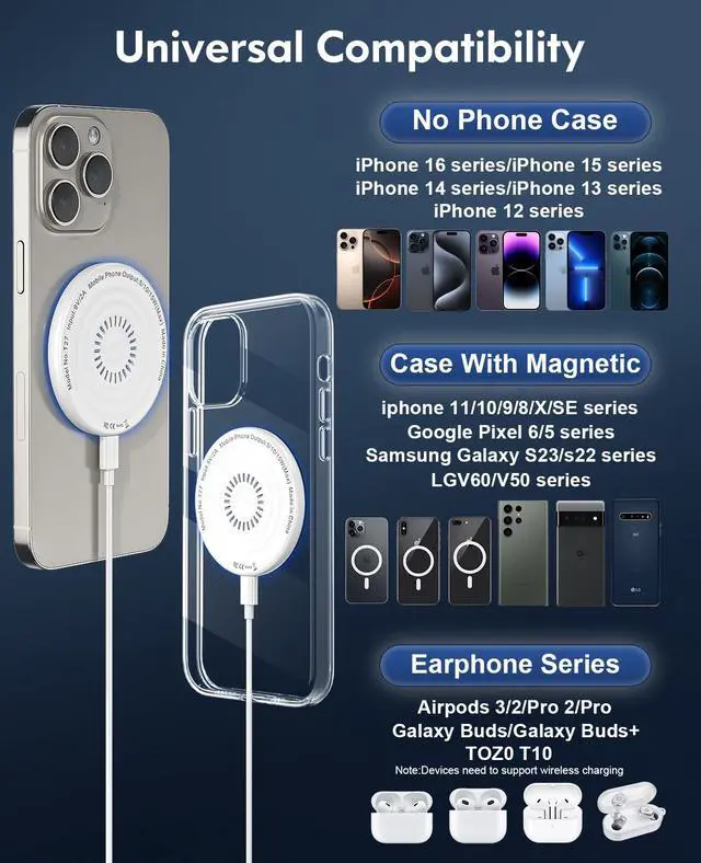 Wide CompatibilityWorks with Apple Devices: Our MagSafe Magnetic Wireless Charger delivers Fast Wireless Charging for iPhone 17 /17 Air/17 Pro/17 Pro Max/16 /16 Plus/16 Pro/16 Pro Max/15/15 Plus/15 Pro/15 Pro Max/14/14 Plus/14 Pro/14 Pro Max/13/13 Mini/13 Pro/13 Pro Max/12/12 Mini/12 Pro/12 Pro. Max Earbuds: AirPods Pro 3/2 (requires wireless charging case) Perfect for Travel/Office/Home
