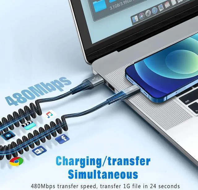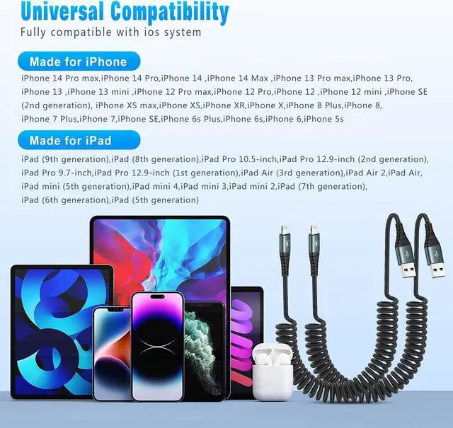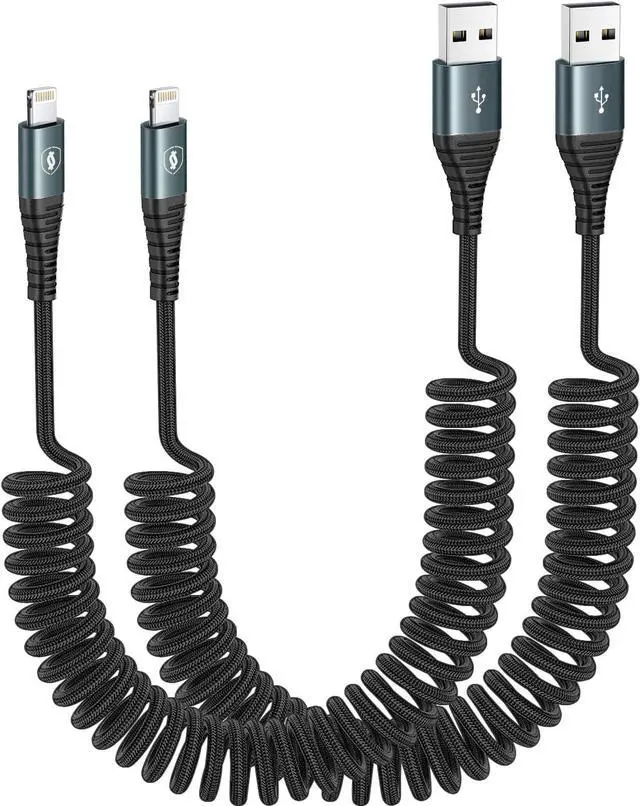 Coiled Lightning Cable Made for Car Specially manufactured for the car disc-shaped lightning cable designed in the shape of a spring retractable at any time to adjust easy to carry and use not easy to knot save space in the car will not cause clutter and trouble. SUPERIOR DURABILITYThe iPhone charger cable is made of nylon braided material with a reinforced design at the connector and over 10 000 bending tests making it stronger and more wear-resistant than ordinary iPhone charger cables. It is also flexible and not easy to be knotted. MFi Certified Coiled Lightning Cable Apple MFi certified lightning charger cables meet all Apple standards.