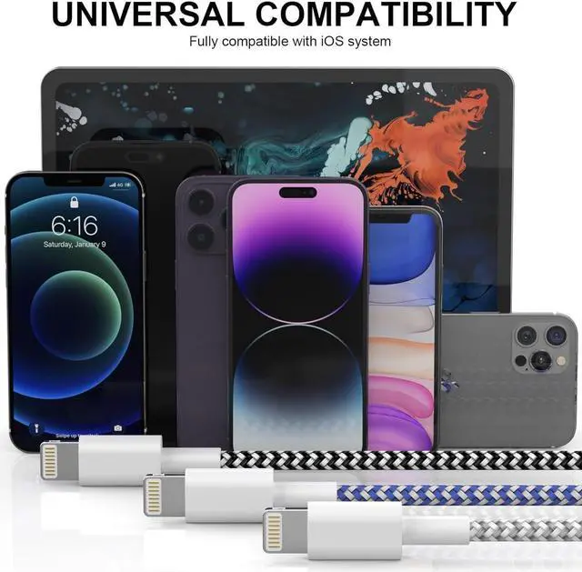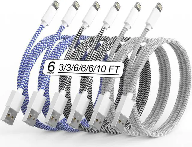 Braided nylon insulation and precision layered welded connectors make the cable more sturdy and stronger than regular iPhone charger cables yet flexible and tangle-free. Universal CompatibilityOur charger cable are perfectly compatible with iPhone 14 13 12 11 11 Pro 11 Pro Max XS Max XS XR X 8 Plus 8 7 Plus 7 6S Plus 6S 6 Plus 6 5S 5C 5 iPad Pro iPad Air Air 2 iPad mini mini 2 mini 4 iPad 4th gen iPod Touch 5th gen iPod nano 7th gen and Beats Pill+. What You Get 6 pack of (3/3/6/6/6/10 FT) iPhone charger 1 year worry-free refund and replacement guarantee.