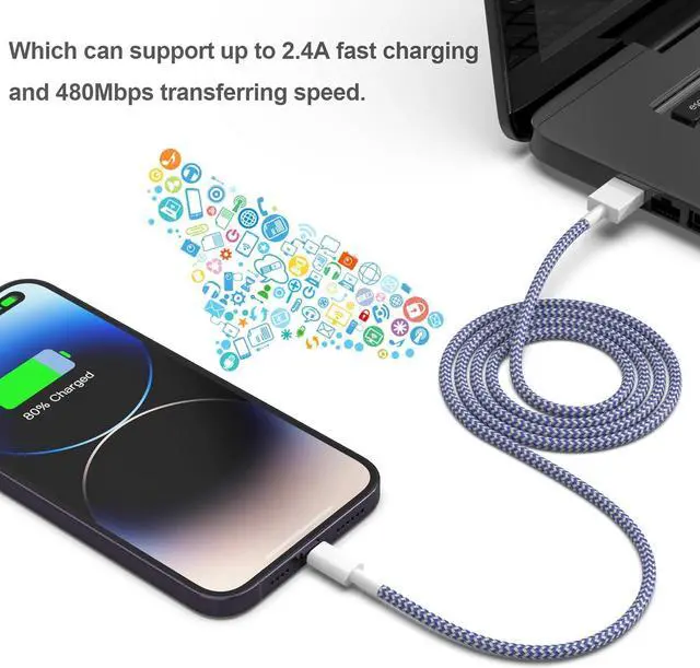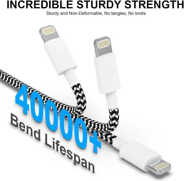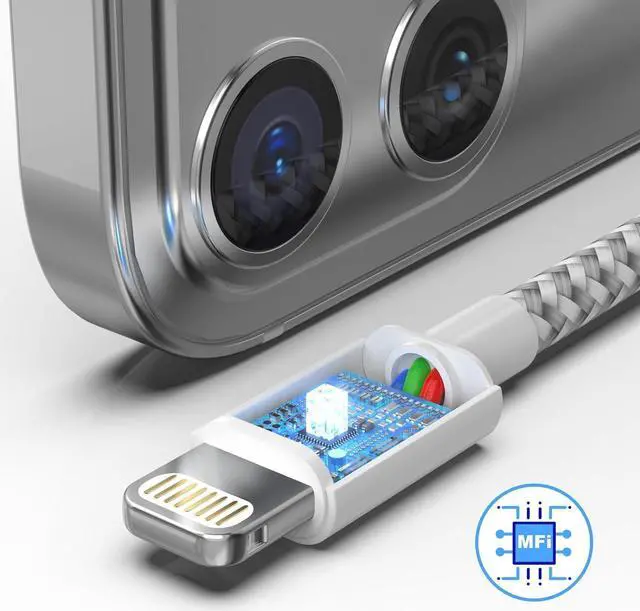 MFI CertifiedThe lightning cable built with chips to ensure 100% compatibility with iPhone. Each iPhone charging cable is built-in original smart chip to ensure safe and sufficient charging without annoying popup message. iPhone Charger Fast ChargingiPhone charger cable is made of high purity copper core and intelligent smart chip with overcharge protection current stabilization protection automatic switching and battery protection which can support up to 2.4A fast charging and 480 Mbps transfer speed. Nylon Braided&High QualityThe iPhone charging cable is designed with a reinforced connector that has passed more than 40 000 bend tests for extra protection and durability.