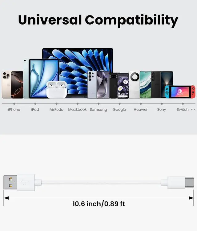 Please note: the cable alone will not enable fast charging a compatible fast charging adapter and phone are required to fully utilize this feature. Certified SafetyThis USB-C cable is certified to meet all relevant electronic safety standards ensuring quality and reliability. You can trust this cable for safe and secure usage. Wide CompatibilityCompatible with any phone tablet or computer. lightn-ing connector supports iPhone 14/13/12/11/XS/XR/X/8/7/6/Pro/Pro Max/Plus/Mini/iPads. USB C connector supports all USB Type-C asfor iPhone 16/15 Galaxy S24/S24+/S24Ultra/S23/S23+/S23 Ultra/S22/S22+/S22 Ultra/S21+/Note 8/S8/S 8 Plus/LG V30/V20/G6/G5 etc. Portable 0.85FT short multi charging cables specially made for charging stations power banks car chargers and some short charging needs you can use it with peace of mind whether you are at work home driving traveling or anywhere else. Just carry it with you and it will meet all your needs. PackageTotal included 10 short usb cables: 2 x c to c cables; 2 x c to lightn-ing cables; 2 x a to c cables; 2 x a to lightn-ing cables; 2 x a to micro usb cables. WarrantyThis product comes with a worry-free 12-month warranty. We are dedicated to providing excellent customer service. If you need any assistance we are here to help and will do our best to serve you.