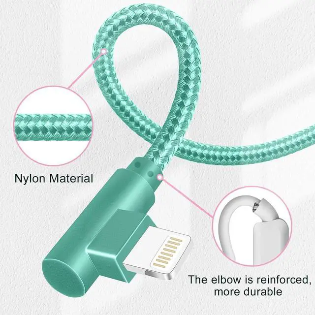90 Degree Design: 90 degree lightning cable provide carefree gaming experience It is very convenient to charge the mobile phone when playing games and watching movies. The data cable will not press your hand let you experience your comfortable feel reduce the pressure on the finger improve the sensitivity avoids bending and breaking the data cable and extends the service life. What You Get3 pack (6FT Pink/Green/Purple) MFI Certified iPhone charging cables. this iPhone charger cable long enough to be convenient to charge your device in bedroom sofa office traveleven when you are on the backseat of the car.