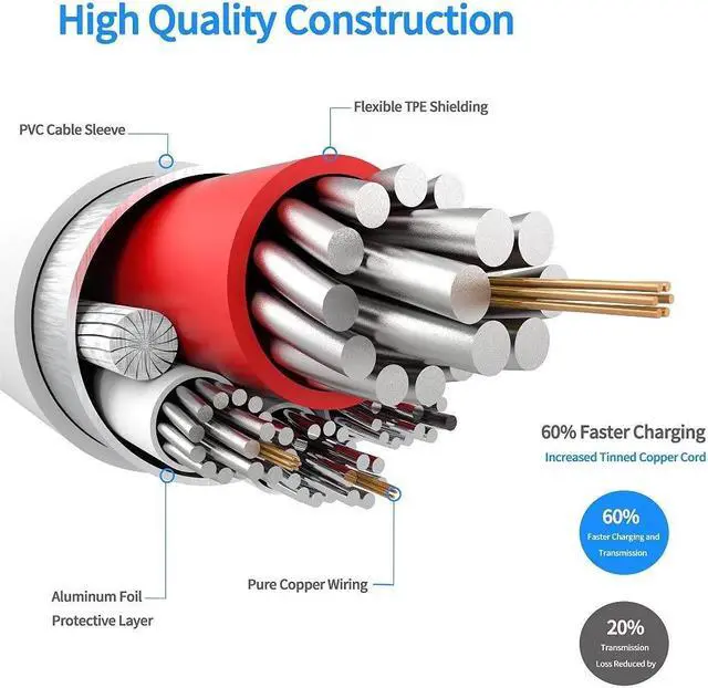 Premium Material Chargers: High-quality tinned copper tinned copper material wire maximizes signal quality and increases durability and ensures charging performance increased by 30%. High coverage aluminum foil makes data transmission is not disturbed by external signals. Charge at fast speeds on your devices.