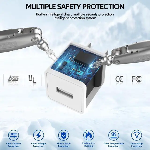 S. Safe Market. These iphone charger adapter multiple built-in safeguards and intelligent IC identification technology protect against short circuit over-current over-voltage over-heating and over-charging with charger iphone. [What's in Package]2 Pack charger block & 2 Pack iphone charger 6 feet cord.