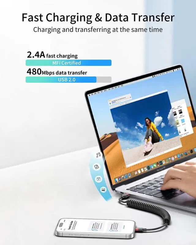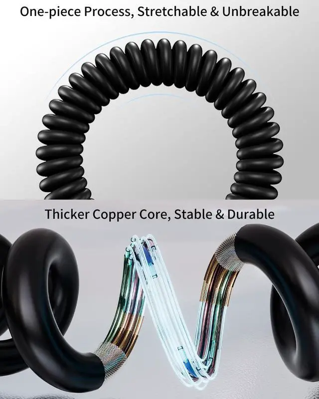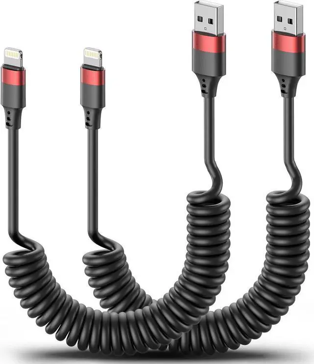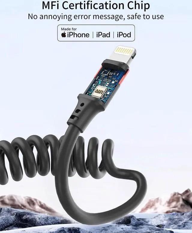 NOTE: Coil loosens after initial stretchesMFi Certified ChipRetractable iPhone charger cord uses high-purity copper wire to ensure a stable connection and supports 2.4A fast charging and 480Mbps data transfer speed. Built-in MFi certified chip no pop-up warning messageMore DurableAluminium alloy casing makes the iPhone coiled charger cord 20 times more resistant to oxidation and the extended mesh tail withstands 45 000+ bends for a longer lifeWide Compatibility iPhone lightning cable coiled compatible with device with Lightning connector for iPhone 14 Pro Max / 13 Pro Max / 12 Pro Max / 11 / XS Max / XR / X / 8 Plus / 7 Plus / iPad Air 2 / iPad mini 2 and more Lightning devicesWhat You Get 2 Pack Coiled USB A to Lightning Cable and 12 months after-sale customer service for any quality related issues
