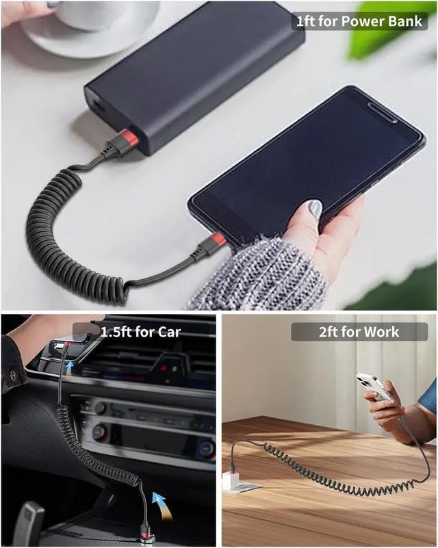 Retractable DesignCoiled iPhone charging cable natural length is 1 feet does not take up space easy to carry; effective stretch length is 1.5 feet to 2.3 feet (3 ft max) flexible length easy to use.