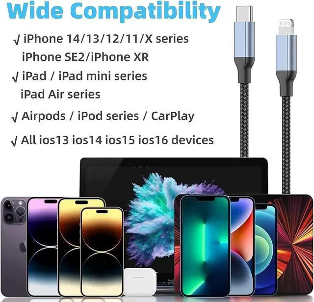 MFi Certified & CarPlay CompatibleLightning cable 2ft for car has a built-in MFI certified chip 2 ft iphone charging cable be able to connect to the vehicles computer to initiate CarPlay effortlessly. MFi certified usb-c iphone charger cable 2 foot supports all iOS versions no warning message pops up. Wide Compatibility2 ft iphone charging cable mfi certified compatible with any device with Lightning connector. 2 foot lightning cable for iphone 2 foot lightning cable carplay compatible with iPhone 14 Pro Max/14 Pro/14 Plus/13 Pro Max/13 Pro/13/13 Mini/12 Pro Max/12 Pro/12/12 Mini/11 Pro Pax/11 Pro/11/XS Max/XS/X/XR/8/7/6 etc.