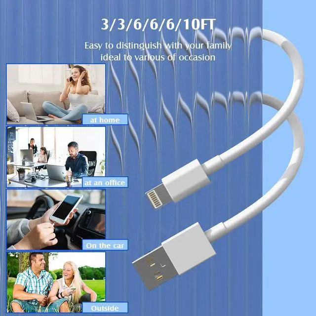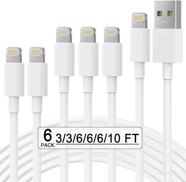 MFi-Certified USB-A to Lightning Cable - Authenticated by for 100% compatibility and safe fast charging with iPhone 14/13/12/11/XR/XS/8/7/6S/SE iPad and AirPodsMilitary-Grade Durability - Triple-layer shielding 5000+ bend-resistant joints and braided nylon casing ensure long-lasting performanceOptimized Fast Charging - Delivers up to 12W high-speed charging and instant data syncing for iOS devices (USB-A wall adapter required)Universal USB-A Compatibility - Works flawlessly with standard USB-A chargers power banks car adapters and laptops for seamless connectivity6-Pack Multi-Size Bundle - 3ft(×2) 6ft (×3) and 10ft cables for versatile home car office and travel use with tangle-free flexible design