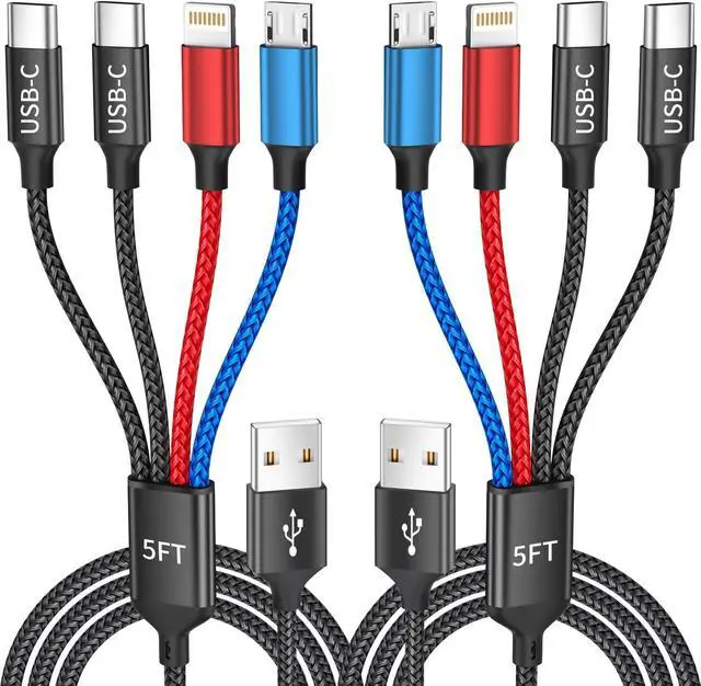 Dual Type-C Port 4 in 1 Charging Cables4 in 1 multi charging cable for multiple devices charge four devices at once with Dual USB-C ports Lightning and Micro USB connectors. Dual type-C ports makes this unviersal usb cable can charge all new-model phone devices. Multiple ports in one cable idea makes the multiple phone charger cords fit all devices compatible with all iPhones androids pads and tablets. Travel Essentials & Car Accessories & 5FT LengthPortable designed as travel/car/camping cables the 5ft 4-in-1 usb to dual usb c cables are travel essentials must have car accessories and beach vacation essentials.