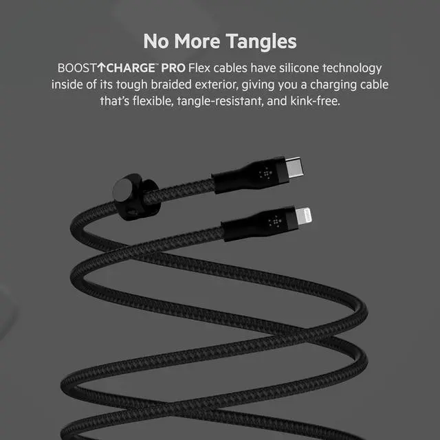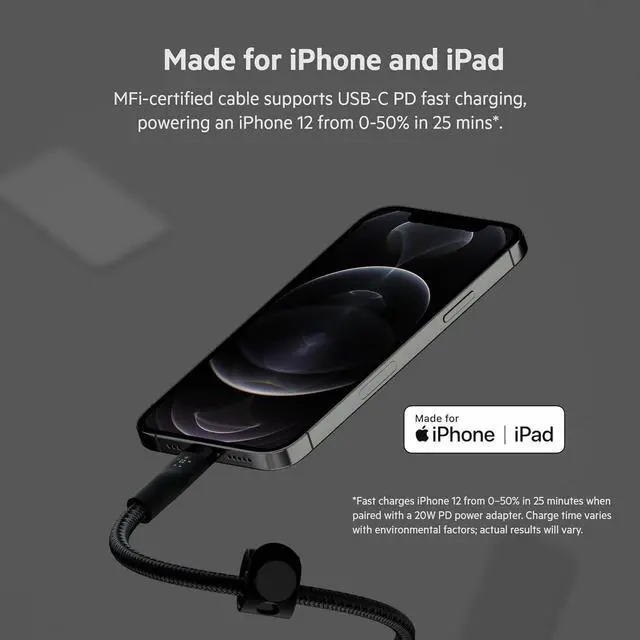 Double-braided exterior is 30X more durable* than ordinary cablesTested to survive 30 000+ bendsUltra-flexible silicone technology resists tangling and kinkingIncludes a cable strap with magnetic clip and a metal plate for easy mounting anywhere and to keep things tidyMFi-certified for iPhone and iPad. USB-C PD compatible supports fast charging of an iPhone 12 or iPhone 13 from 0-50% in 25 minutes**