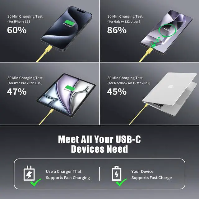Speed Charging Cable: The type c to type c cable 2.2X faster than 3.1A version. Fast chargeing for USB C Phone from 0% to 88% in 35 minutes iPad Pro 64% and Macbook air 50%Universal