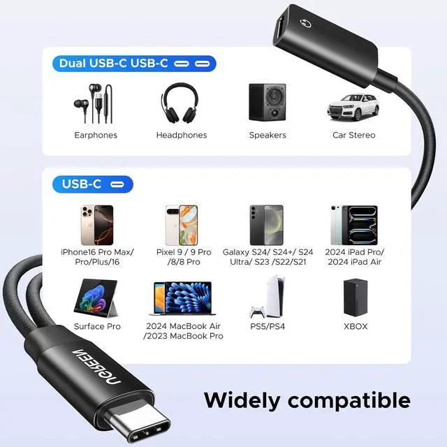 Wide Compatibility: The dual USB C headphone and charger adapter is compatible with most of the USB-C devices(Note: External USB-C to 3.5mm adapters are not supported). The USB C port is compatible with iPhone 17 Pro Max/17 Pro/Air/17/16 Pro Max/16 Pro/16 Plus/16, Galaxy S25 Ultra/S25+/S25, Pixel 10 Pro/Pixel 10 Pro XL/Pixel 10/Pixel 10 Pro Fold /9 Pro/9, MacBook Pro/Air 2024, iPad Pro/Air 2020-2024, XPS 17/15/13, Dell, HP Chromebook x360, Surface Book 3, Samsung Tablet S9, Note 20, LG V40, Valve Steam Deck, Quest 3S, Switch 2 and more. [*Note: NOT compatible with Amazon Fire Max]