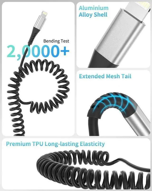 Coiled Lightning Cable For CarThe Lightning to USB C Cable 3 Feet features a retractable spring-loaded design with excellent stretch and toughness. It can extend up to 3 Feet providing enough length for various scenarios such as in-car use travel home office cycling and using with power banks. While not in use it retracts to a compact 1FT length making it easy to carry and keep your surroundings tidy. Easy Carplay ConnectionThis Type C to Lightning Cable with [MFi Certified] to ensure perfect compatibility with your Lightning device without triggering any pop-up warnings. It connects seamlessly to CarPlay allowing you to charge and navigate at the same time.