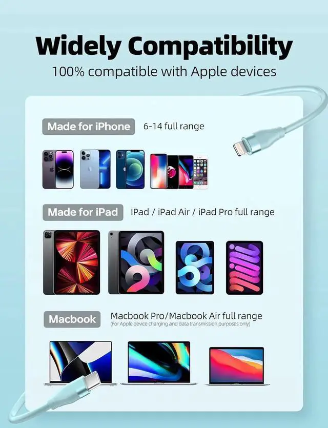 Compatibility: Usb c to iPhone cable supports PD fast charge for iPhone 14/13 Pro/13 Pro Max/13 Mini/12/12 Pro/12 Pro Max/12 Mini/11/11 Pro/11 Pro Max/XS/ Max/XS/XR/X/8 Plus/8 and iPhone 7