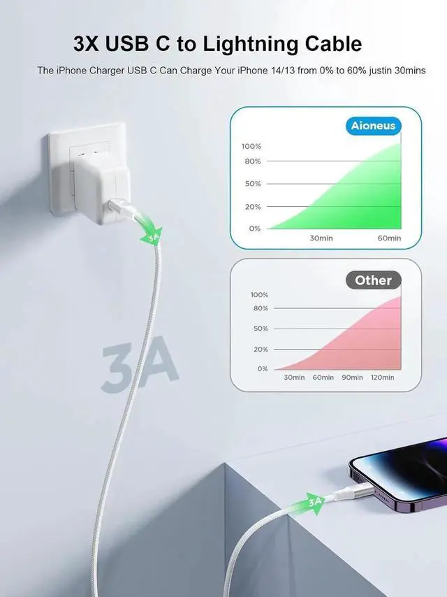 Charger USB C: Aioneus usb c to lightning cable features an ultra-durable construction Tangle-free Nylon Braided Design make the usbc to lightning cable more sturdier than others. Each cable has been tested with 30000+ times bend lifespan and strong bearing capacity. The durability is three times as long as that of ordinary charging cables.