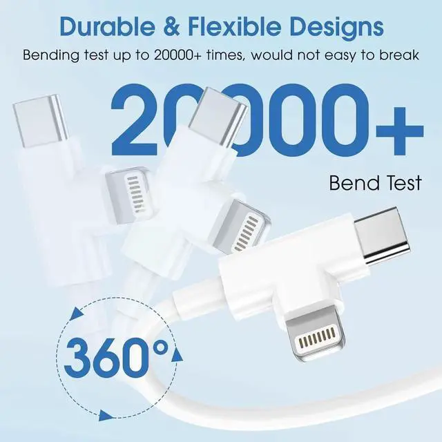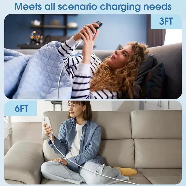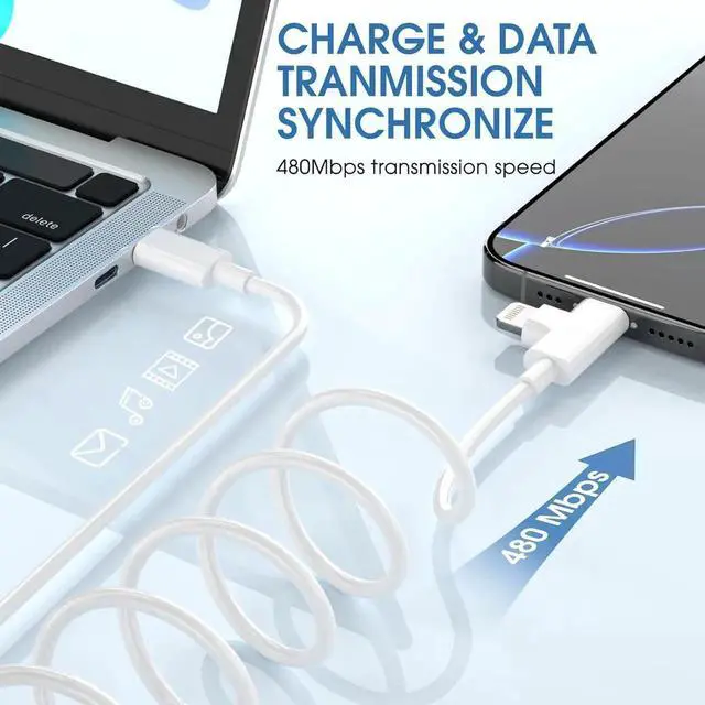 Dual-Port for Your NeedsUSB-C and USB C/Lightning ports meets your normal various needs and comfortable to play your iPhone or iPad when you relaxing in bed seat at car or lying at sofa. High speed data transfer up to 480 mbp/s for transfer photos music videos files. High-quality MaterialsThis 90 Degree Lightning Cable uses the premium TPE material and is tested for up 20 000+ bends making it more durable. Solid and durable shell gives the cable stronger protection performance than others. What You Get2 Pack 6ft/3ft iPhone charging cords. For any defective item or the item becomes defective while using no matter how long it has passed the purchase date please contact us for fast replacement.