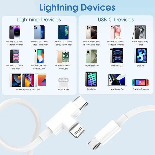 90 Degree Right Angle DesignUSB C and Lightning Cable 2 in 1 design not only give you great convenience of playing games increase winning probability but also easier to watching movies or videos when charging power. The USB-C connectors are sturdy and reliable providing a secure connection every time you charge. Wide Compatibility Cables can compatible with a range of iPhone devices including iPhone 14/14 Pro/14 Pro Max/13/13 Pro/13 Pro Max/12/12 Mini/12 Pro/12 Pro Max/SE 2020/11/11 Pro/11 Pro Max/XS/XS Max/XR/X 8 Plus iPhone 16/16 Pro/16 Pro Max/16 Plus/15/15 Pro/15 Pro Max/15 Plus/2021/2020/2018 fits iPad Pro 12.9 /11 inch fits iPad Air 5th fits iPad Air 4th fits iPad Mini 6th Gen S23 S23+ S23 Ultra S22 S21 S20 S10 7 Pro and more USB-C device.