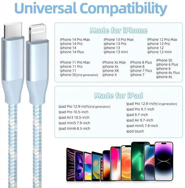 Nylon Braided: The USB C to Lightning cable is braided with nylon material for extra protection and durability. Braided nylon insulation and precision layered welded connectors make the cable more durable stronger and tangle-free than regular iPhone charger cables. Rigorously tested over 10 000 bends to withstand daily connection demands and long-term useQuick Charge & Data SyncThe iphone charging cable adopts the latest MFI C94 lightning end which is specially designed for fast power supply which can charge your phone fast. Its charging speed is faster than ordinary lightning cables. It also supports data transfer speeds of up to 480Mbps to easily transfer music photos and files between iPhone and Macbook in secondsWide Compatibility &