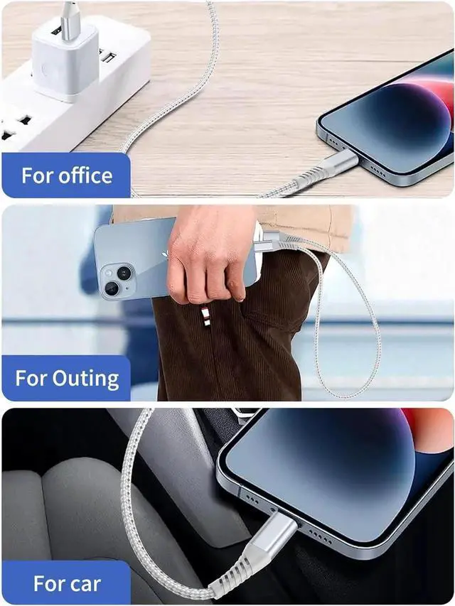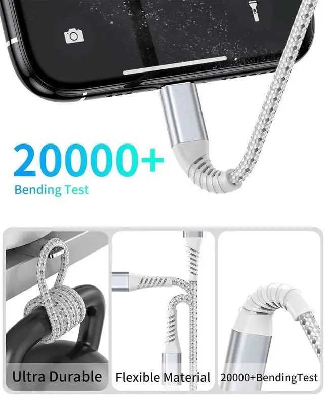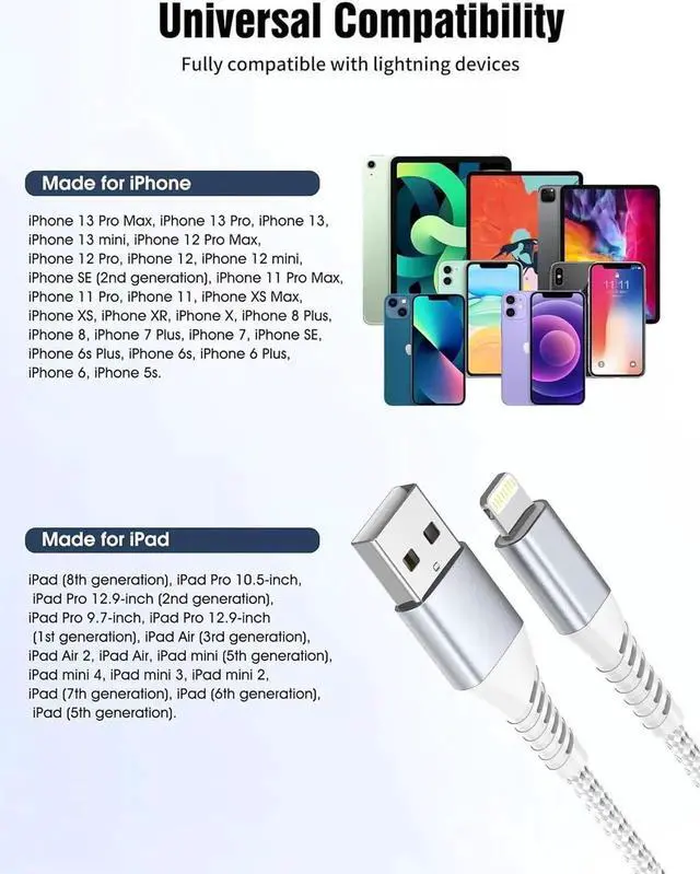 Ultra Durable iPhone Lightning CableThis USB to iPhone cable features a top-notch design with high-quality nylon braided construction and an upgraded 3D aluminum shell connector. Having endured more than 20 000 bend tests and over 10 000 plug tests it exhibits exceptional resistance against cracking and breaking. Wide CompatibilityCompatible with all Lightning iOS products including iPhone 14/14 Plus/14 Pro Max iPhone 13/12/11/Pro Max/Mini iPhone XS/XR/X/SE iPhone 8/7/6/Plus. Also compatible with iPad iPods and AirPodsWhat you get3Pack 2Feet USB A to Lightning Braided Cable and 12-month after-sales customer service if you have any questions we will resolve your issue within 24 hours.
