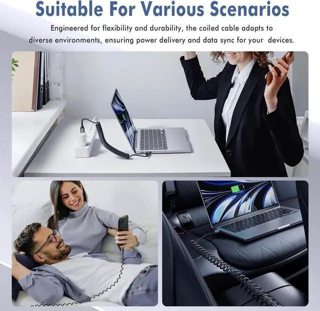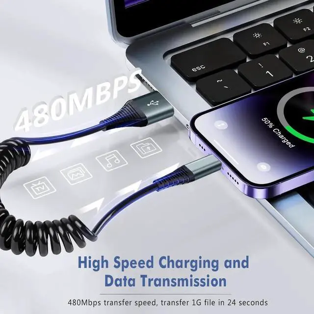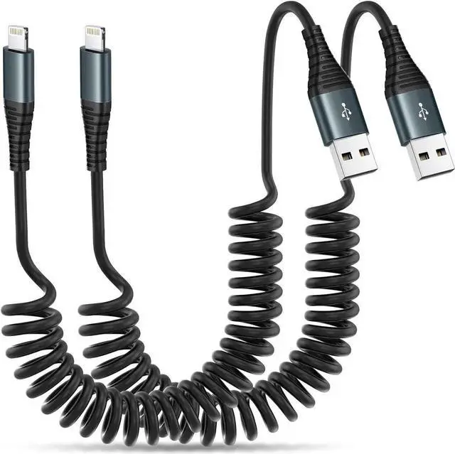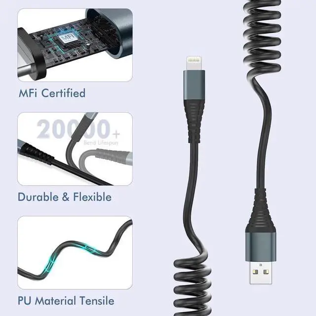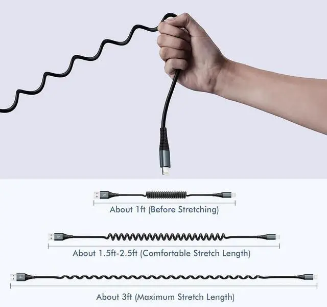 Coiled Lightning CableA retractable iPhone car charger designed with high-elasticity TPU material and a spring structure (tested for 20 000+ stretch cycles). The short iPhone charger cord features a flexible coil that resists deformation smoothly extends from 1ft to 3ft and saves space while preventing tangles with its Lightning connector remaining securely attached even on bumpy roads.