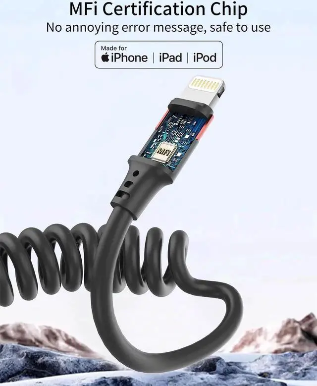 NOTE: Coil loosens after initial stretchesMFi Certified ChipRetractable iPhone charger cord uses high-purity copper wire to ensure a stable connection and supports 2.4A fast charging and 480Mbps data transfer speed. Built-in MFi certified chip no pop-up warning messageMore DurableAluminium alloy casing makes the iPhone coiled charger cord 20 times more resistant to oxidation and the extended mesh tail withstands 45 000+ bends for a longer lifeWide Compatibility iPhone lightning cable coiled compatible with device with Lightning connector for iPhone 14 Pro Max / 13 Pro Max / 12 Pro Max / 11 / XS Max / XR / X / 8 Plus / 7 Plus / iPad Air 2 / iPad mini 2 and more Lightning devicesWhat You Get 2 Pack Coiled USB A to Lightning Cable and 12 months after-sale customer service for any quality related issues