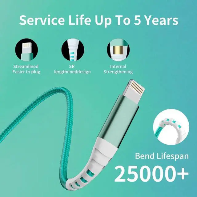 Durable & Last: 25 000+ bending lifespan can meet the long-term daily use (the lifespan is up to 10-15 years). Covered with specialized military fiber the flexiblity and durablity of the iphone charger cords increased by 200%. Plus the high-quality aluminum housing makes the iphone cables resistant to heat and corrosion.