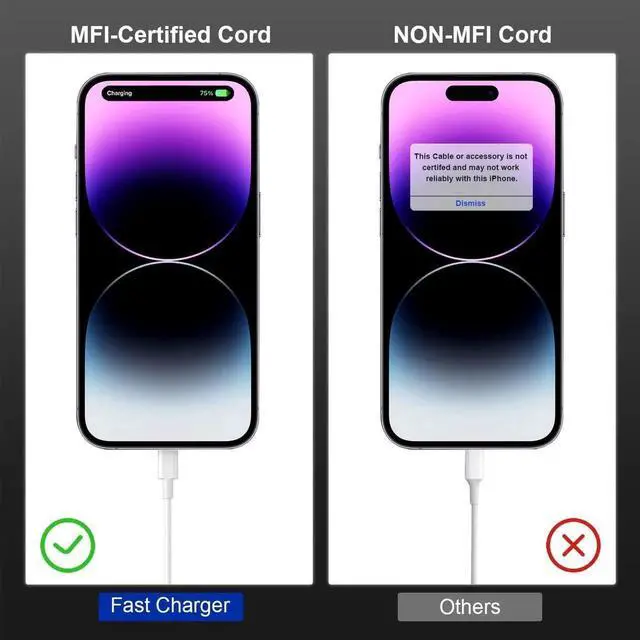MFi Certified Lightning Cable6 ft USB-C to Lightning Cable with MFi certification made for iPhone14. The latest C94 lightning connector to ensure that no warning messages pop up and is fast charging cord designed for iPhone14 pro. For iPhone14 Fast Charging Cord USB C to lightning cable charging your iPhone14/13/ 12 from 0% to 50% within 30 minutes. Compatible with iPhone14/iPhone14 pro/iPhone14 pro max/iPhone14 max/iPhone 13/ 13 Mini/ 13 Pro/ 13 Pro Max/ iPhone 12/ 12 Mini/ 12 Pro/ 12 Pro Max/ SE 2020/ iPhone 11/ 11 Pro/ 11 Pro Max/ XS/ XS Max/ XR/ X/ 8 Plus/ 8/ 7 Plus/ 7/ 6s Plus/ 6s/ 6 Plus.