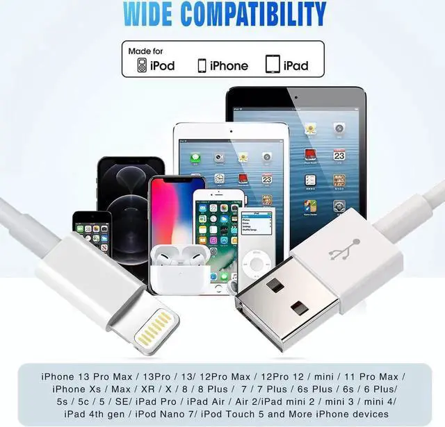 Universal Compatibility: Precise interface design iphone charging cord compatible with iPhone 14 Mini / 14 / 14 Pro / 14 Pro Max /iPhone 13 Pro Max/13 Pro/13/12 Pro Max/12 Pro/12/iPhone 11/Pro/iPhone XS/iPhone Max/iPhone XR/iPhone X/iPhone 8 Plus/iPhone 8/iPhone 7 Plus/iPhone 7/iPhone 6s Plus/iPhone 6s/iPhone 6 Plus/iPhone 6/iPhone 5s/iPhone 5c/iPhone 5/iPad Pro/iPad Air/Air 2/iPad mini/mini 2/mini 4/iPad 4th gen/iPod Touch 5th gen/ iPod. Each lightning cable was updated to match the iphone system.
