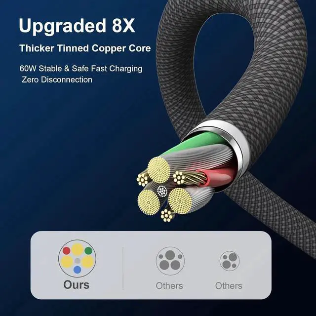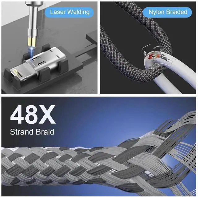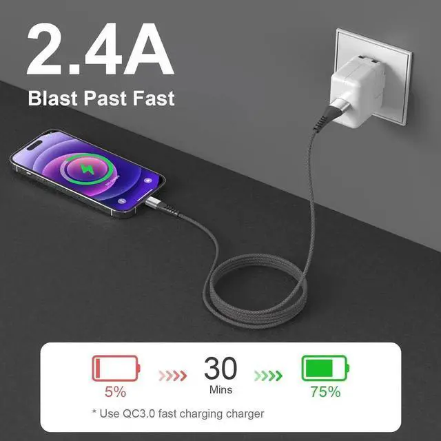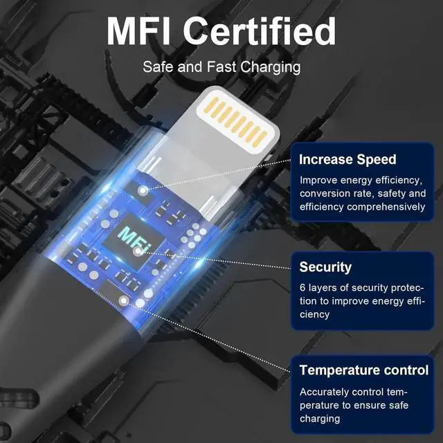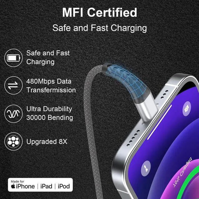 MFi CertifiedMade with an authorized original chip The fast charger iphone cable is guaranteed to be compatible with your iPhone. you can rest assured that this cable won't happen any warning pop-up allowing you to indulge in safe and fast charging for all your devices. Fast Data Transfer and ChargingHigh purity copper core and intelligent smart chip enhance charging and data transfer speed of the lightning charger iphone for your iPhone. Charging and data transfer can be performed simultaneously supporting fast charging of up to 2.4A and transmission speed of 480Mbps. Safe and Enhanced Durability With its 48 strands of recyclable nylon braided design our iphone lightning charger cable is built to withstand wear and tear and resist tangling withstand up to 30 000 bends.