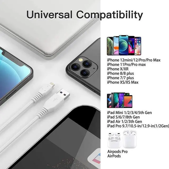 Bullet PointCompatlbillity: Compatible All iphone fast-charging charger cable support IOS13/12/11/10. Compatible with iphone 11/11 Pro/ Pro Max /iPhone XS Max/XS/XR/X 10/ 8 Plus /8/7 Plus/7/6s Plus/6s/6 Plus/6/5s/5 /5/iPad Pro /iPad Air/Air 2/iPad mini/mini 2/mini 4/iPad 4th gen/iPod Touch 5th gen/iPod Nano 7th gen and