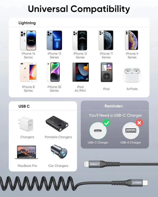 ![Alt view image 7 of 7 - JAENFONG USB C to Lightning Cable [1.3FT-3FT] 2 Pack MFi Certified Coiled USB-C to Lightning Cable for Car iPhone Charger Cord Compatible with iPhone 14/13/12/11 Pro Max Mini X XS XR SE iPad/Carplay](https://c1.neweggimages.com/productimage/nb640/C280S25092307PSQ27F.jpg)