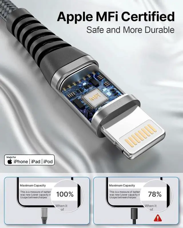 MFi Certified Lightning Cable: Mfi Certified iPhone Charger Cord will not pop up warning messages protecting your battery from overvoltage and overcurrent and ensuring your and your device's safety. Long 3M iPhone charging cables you can use freely in your bedroom office and even in the backseat of your car? Super Durable iPhone