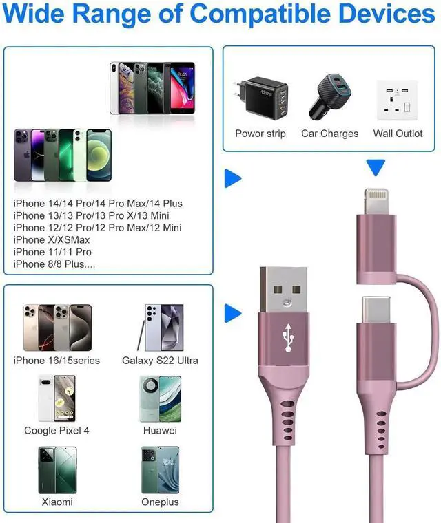 MFi Certified: Pink retractable lightning cable with MFi certification using the original chipset for fast charging which can safely and quickly charge your iPhone No pop-up warnings. In addition this 2-in-1 multi-function charging cable supports 480Mbps data transfer you can not only charge your device quickly but also transfer large files instantlyWidely