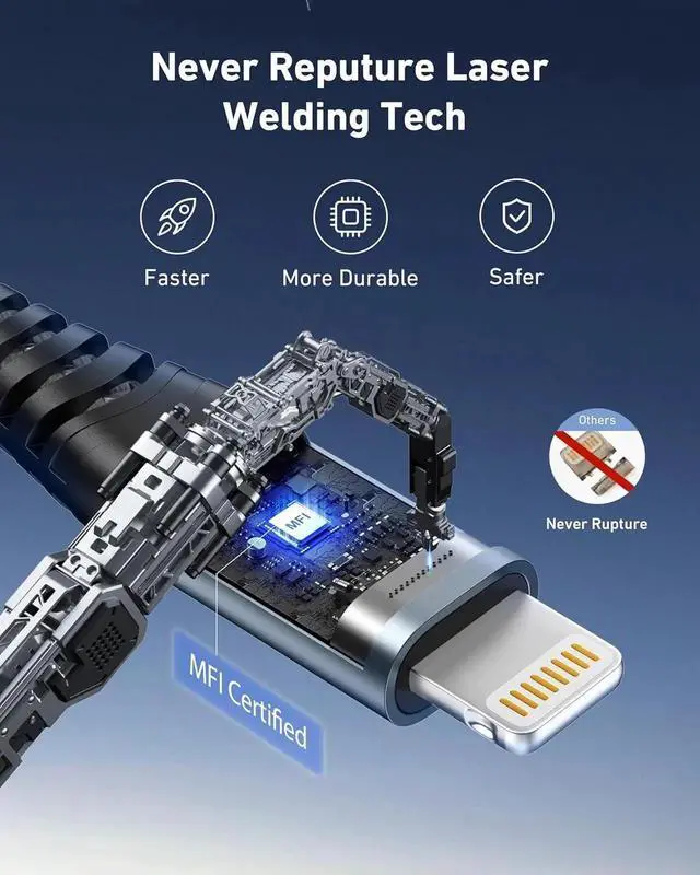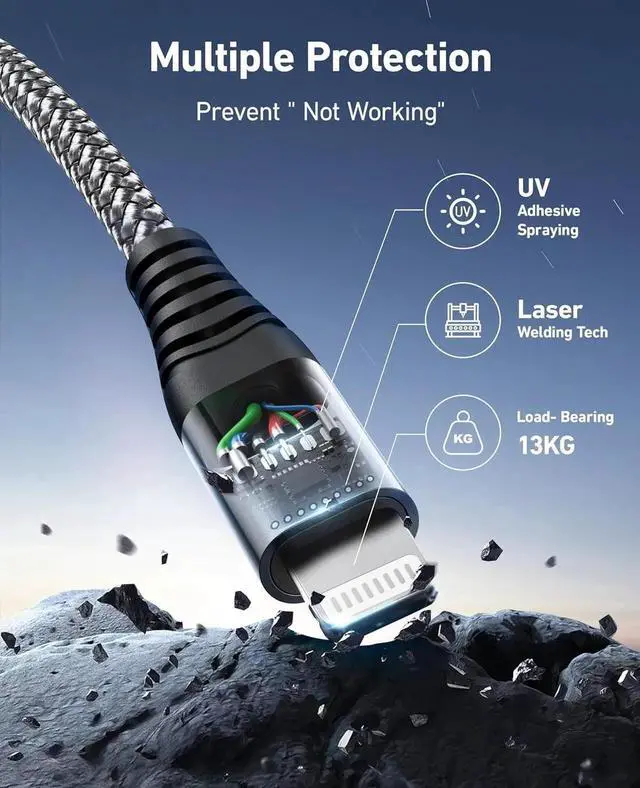 Lightning Cable: The iPhone charger fast charging cable built-in an smart chip to ensure 100% compatibility with all iPhone and iOS devices with lightning port; it built-in laser welding technology which ensure the metal part won't break. The copper core part is reinforced with UV glue to prevent the solder joints from falling off.
