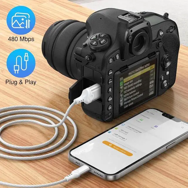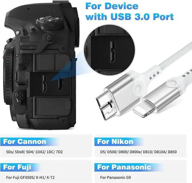 For camera with Micro B USB 3.0 port such as for Canon 5Ds/ 5DsR/ 5D4/ 1DX2/ 1DC/ 7D2; for Nikon D5/ D500/ D800/ D800e/ D810/ D810A/ D850; for Fuji GFX50S/ X-H1/ X-T2; for Panasonic G9The Micro USB 3.0 camera adapter cable compatible with iPhone 14/ 14 Plus/ 14 Pro/ 14 Pro Max/ 13/ 13 Mini/ 13 Pro/ 13 Pro Max/ 12/ 12Mini/ 12Pro/ 12 Pro Max/ 11/ 11 Pro/ 11 Pro Max/ Xs/ Xs Max/ X/ 8/8 Plus/ 7/ 7Plus/ 6/ 6 Plus/ 5/ 5S/ SE and Air /Mini /ProPlug and play easy to use mo App needed and no need to take out the camera's memory card.
