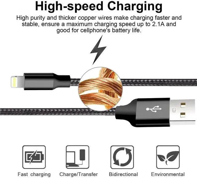 ? DURABLE & STRONG -- Tangle-free nylon braided fiber material strong and wear-resistant make CUGUNU iPhone charger cable more durable more flexible than standard iPhone cable. Reinforced stress points designed to withstand 10000+ cycles of flex test without inner failure.? FAST CHARGING -- certified built-in terminal and smart chip ensure your devices are charged safely at their fastest possible speed. High-quality four-core copper wires support a maximum charging speed up to 2.1A and data transmission at speeds of up to 480Mbps.? STRICT QUALITY CONTROL -- Unique design prevents the aluminum case at both ends of iPhone Charger cord from coming unglued.