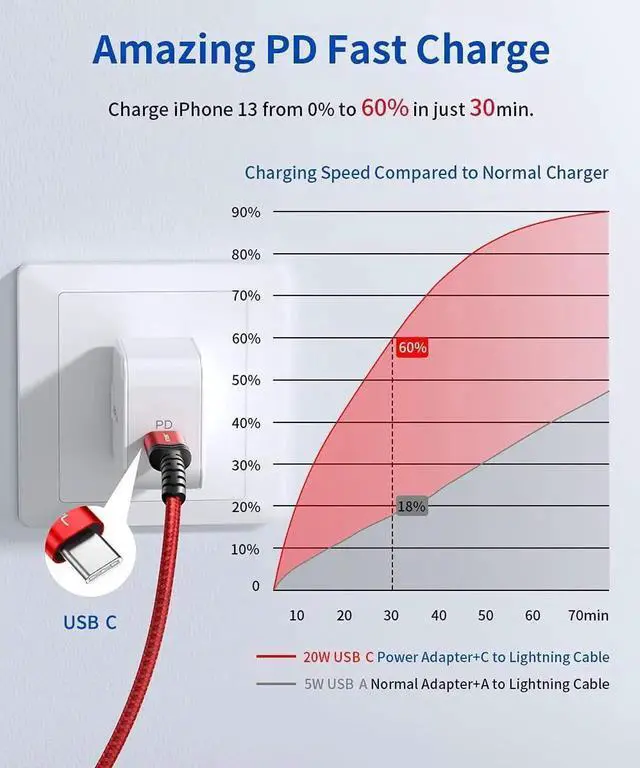 Power Delivery Fast Charging: Charge your iPhone 14 from 0% to 60% in just 30min. JSAUX USB-C to Lightning Cable supports fast charging for iPhone 14 14 Pro 13 Pro Max 12 Pro 11 Pro Max SE X XS XR XS Max 8 8 Plus and other later models when using your USB-C Power Delivery Charger (including 18W 20W 29W 30W 61W or 87W USB-C Power Adapter).?