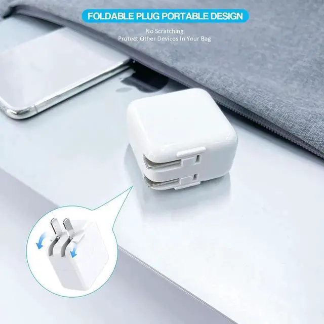 ?? iPad Charger Foldable PlugWith 100-240 volt input and replaceable iPad charger block this iPad iPhone Charger is ideal for worldwide travel. Designed for avoiding any possible scratch damage in your pocket the 90 degrees foldable block is perfect for use both at home and on the go. Besides quick-charge USB port provides Max output power charge your devices up to 2.5 x faster than original 5W charger saving over 1 hour for you.?? 10 ft Long Lightning CordYou could connect your MacBook/Pro with iPhone/iPad directly and enjoy the 480 Mbps data transfer speed.