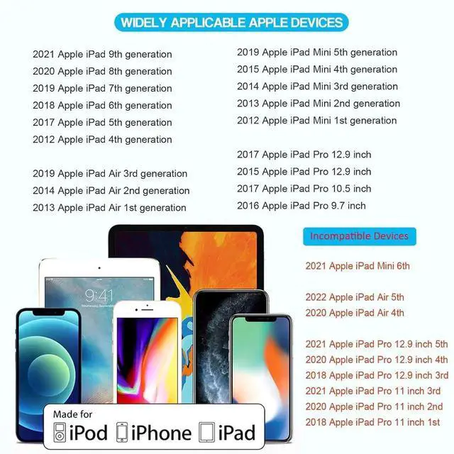 Tangle-free 10 Foot length is convenient for usage while charging and sync at home/office/travel in bed hotel rooms and more.?? iPad Lightning ChargerMFi is a kind of express license for external accessories produced by authorized accessory manufacturers. It is the abbreviation of Made for iPhone / iPod / iPad. The certification test process is extremely demanding with a pass rate of only 2%. With our MFI approved chargers for iPads and iPhones no more trigger warning messages pops up.?? Applicable Equipments 2021 iPad 9th generation/2020 iPad 8th generation/2019 iPad 7th generation/2018 iPad 6th generation/2017 iPad 5th generation/2012 iPad 4th generation/2019 iPad Mini 5th generation/2015 iPad Mini 4th generation/2014 iPad Mini 3rd generation/2013 iPad Mini 2nd generation/2012 iPad Mini 1st generation/2019 iPad Air 3rd gen/2014 iPad Air 2nd gen/2013 iPad Air 1st gen/2017 iPad Pro 12.9 inch/2015 iPad Pro 12.9 inch/2017 iPad Pro 10.5 inch/2016 iPad Pro 9.7 inch/iPhone/AirPods?? What You Get1 * iPad Charger Fast Charging Block 1 * 10FT USB to Lightning iPad Charger Cord