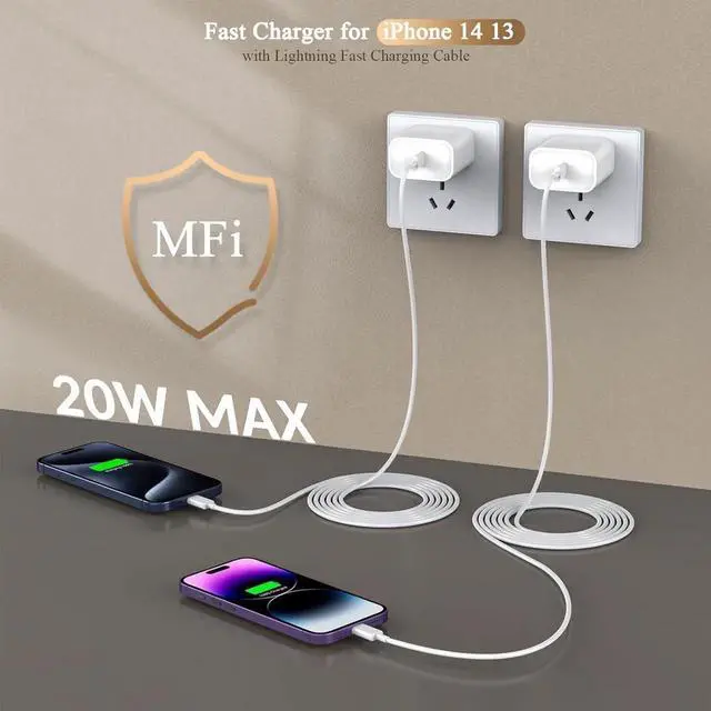 3X Faster Charger for iPhone 14 13 12PD 3.0 iPhone charger fast charging with iphone charger 10ft supports 20w power delivery fast charge which will charge iphone 14 13 12 up to 50% just in 30 minutes--3x faster than the 5W original iPhone charger which can save more time in your life and work. 2Pack Safety Efficient Charger2set iPhone Fast Charger Compliant with MFi UL safety standards this iPhone charger comes with a wide range of safety features. iPhone charger block and cable automatically provide multiple protection measures. iPhone chargers have multiple charge protection which completely protects your devices from overvoltage overheating short circuit etc.