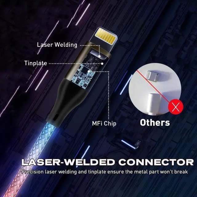 The built-in smart chip offers multiple protections against overcurrent overvoltage short circuits and overheating ensuring safe and stable charging for a worry-free experience.? MFi Certificated Glow Wire Charger iPhone --- Equipped with the original MFi chip the LED iPhone charging cable fully supports all iOS versions and future updates ensuring that no warning messages appear. This guarantees safe charging at maximum speed for your devices.? Widely Compatibility --- Our RGB Gradient USB Lightning Charging Cable is compatible with a wide range of devices including iPhone 14 13 12 11 11 Pro 11 Pro Max 11 Mini XS Max XS XR X 8 Plus 8 7 Plus 7 6S Plus 6S 6 Plus 6 5S 5C 5 as well as iPad Pro iPad mini mini 2 mini 4 and many more iOS devices.