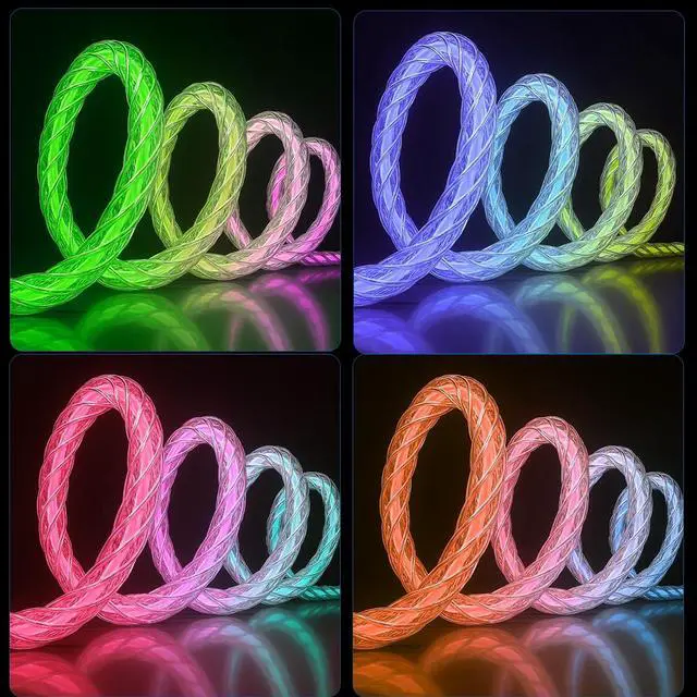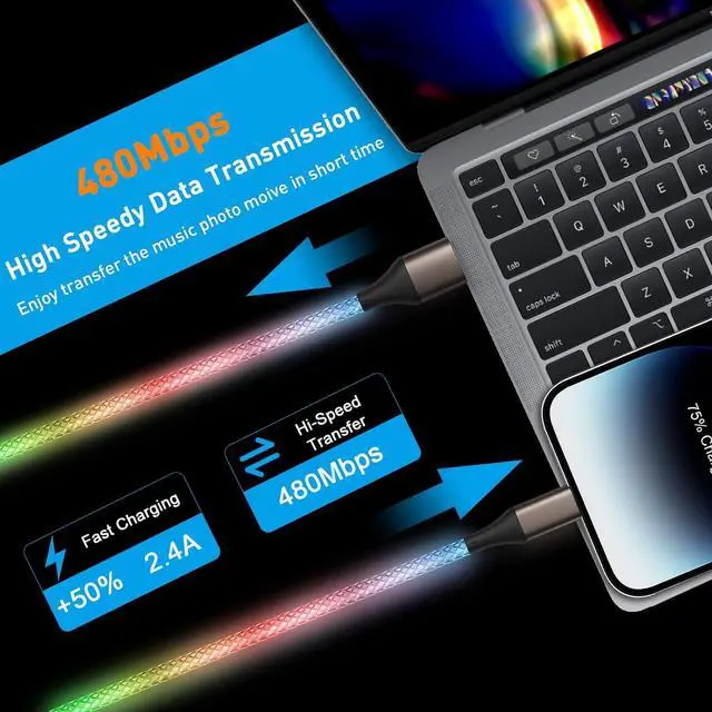 ? Cool Glowing iPhone Charger --- Once plugged in the LED lights will illuminate and blink in vibrant colors slowly changing to create a stylish and vivid charging experience in the dark. Whether at home or in your car every night will feel like a celebration.? Durable --- The LED charging cable features reinforced high-quality copper wire with a braided one-piece molding process making it wear-resistant and capable of withstanding over 50 000 bends.? 2.4A & 480Mbps --- Our RGB lighted USB Lightning data cable supports safe high-speed charging at 2.4A and fast data transfer up to 480Mbps allowing you to sync photos music videos and files effortlessly while charging your device.