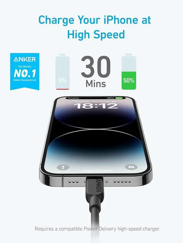 High-Speed Compatible: Charge an iPhone 14 Pro to 50% in just 30 minutes when paired up with a compatible Power Delivery charger (charger not included).