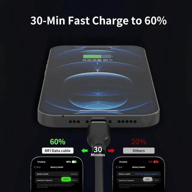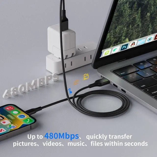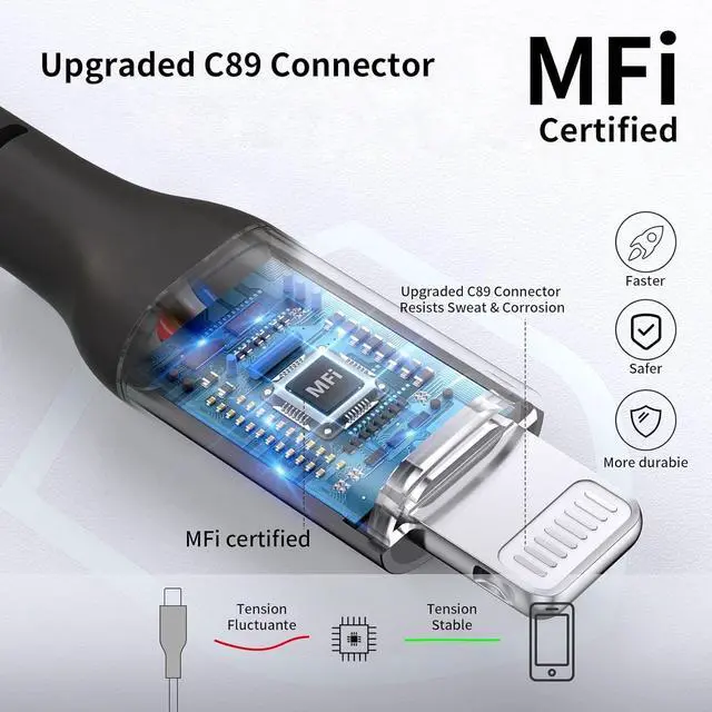 MFi Certified & Safe Charging This iPhone charger cable is MFi certified ensuring 100% compatibility with all iOS devices. Features an upgraded C89 connector that solves the gold contact corrosion problem caused by sweat providing safer and more efficient charging without overheating or pop-up warnings. 12W Fast Charging & 480Mbps High-Speed Sync Equipped with advanced charging technology this MFi certified cable supports 12W ( 2.4A ) fast charging powering your iPhone from 0 to up to 60% in just about 30 minutes significantly faster than standard 5W cables. It also supports 480Mbps high-speed data transfer with USB 2.0 standard allowing you to sync your music photos and files in seconds without any lag.