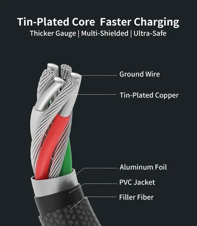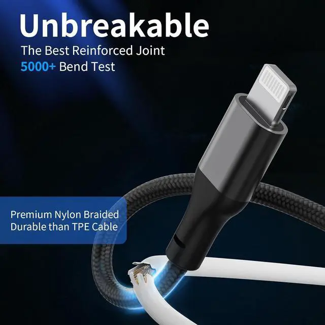 Enhanced Durability with Nylon Braided Reinforced with high-quality nylon braiding that withstands bending and stretching 12 000+ times. The tough exterior resists tangling and daily wear significantly extending the cable's lifespan compared to ordinary cables. Advanced Engineering & Secure Connection Built with tin-plated copper cores and multi-layer shielding for faster charging and stable data transmission. The aluminum alloy housing enhances durability and ensures a secure connection that won't loosen easily. Wide Compatibility & Reliable Performance Works with all Lightning iOS devices including iPhone 14/13/12/11/XR/XS/8/7/Plus iPad and iPod. Designed for daily use with 10 000+ plug-and-play cycles offering you a reliable charging solution.