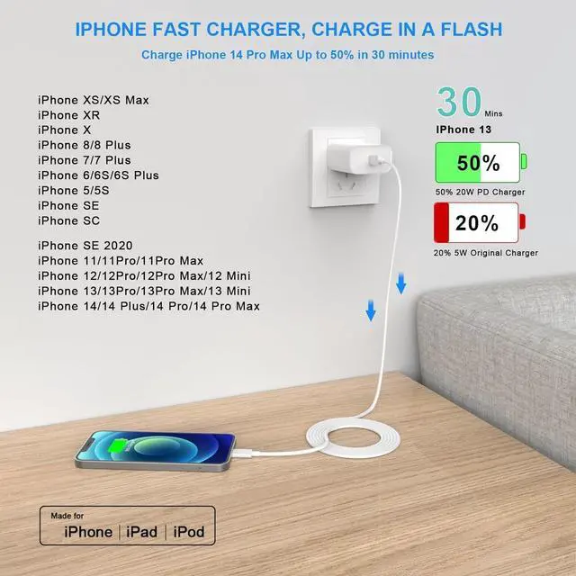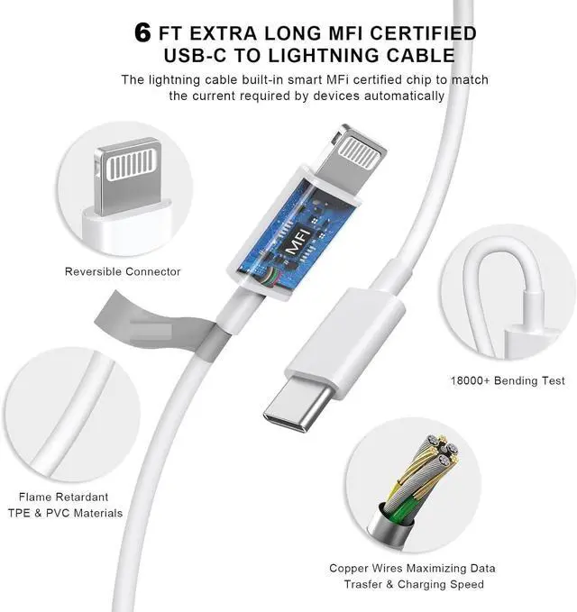 iPhone Fast Charger Cable 6ftUSB-C to Lightning Cable with MFi certification made for iPhone14. The latest C94 lightning connector to ensure that no warning messages pop up and is fast charging cord designed for iPhone14 pro. Support iOS19 System. iPhone14 Fast Charging Cord USB C to lightning cable charging your iPhone14/13/ 12 from 0% to 50% within 30 minutes. Compatible with iPhone14/iPhone14 pro/iPhone14 pro max/iPhone14 max/iPhone 13/ 13 Mini/ 13 Pro/ 13 Pro Max/ iPhone 12/ 12 Mini/ 12 Pro/ 12 Pro Max/ SE 2020/ iPhone 11/ 11 Pro/ 11 Pro Max/ XS/ XS Max/ XR/ X/ 8 Plus/ 8/ 7 Plus/ 7/ 6s Plus/ 6s/ 6 Plus.