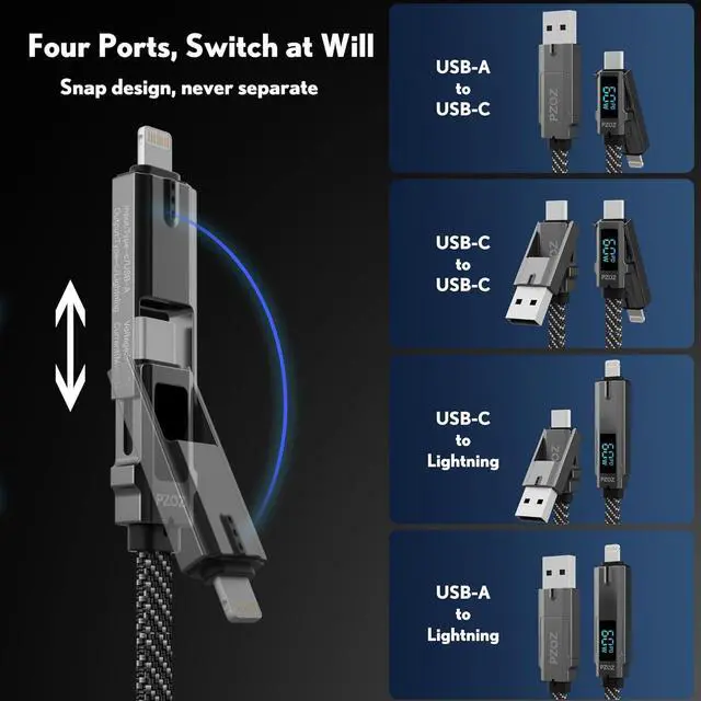 4-in-1 & LED Display The design concept of PZOZ simplifies your life. It combines four ports and LED display into one cable. USB A to C USB A to Lightning USB C to Lightning and USB C to USB C. Simplicity and efficiency. Smart LED DisplayBuilt in intelligent chip displaying charging status and visible charging power at any time.